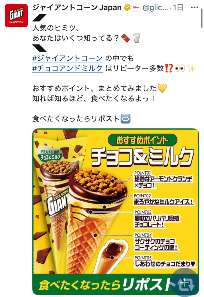 例えば「アイス食べたいな」と無意識に思ったタイミングでこの投稿が流れてきたら、即座に頭の中で商品が想起され、「買いたい」という行動に直結します。