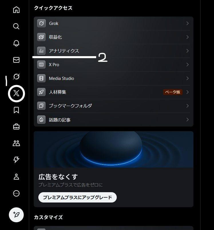 アナリティクスにアクセスするには、webブラウザのX(旧Twitter)の左カラムにある「プレミアム」をクリックして、表示されるメニューから「アナリティクス」を選択します。