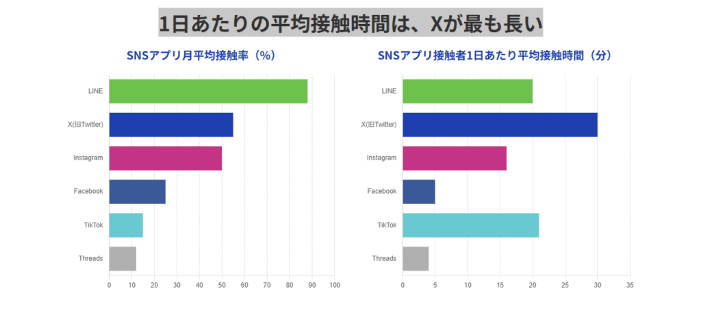 Xは1日あたりの平均接触時間が他のSNSより長いことをご存知ですか?TikTokだと思われがちですが、実は最も長いのはXなんです。接触時間が長いということは、企業にとってじっくりユーザーに想いを届けられる場であるということ。単なる一瞬の露出ではなく、読んでもらい、理解してもらい、信頼を積み上げられるのがX運用の大きな魅力です。