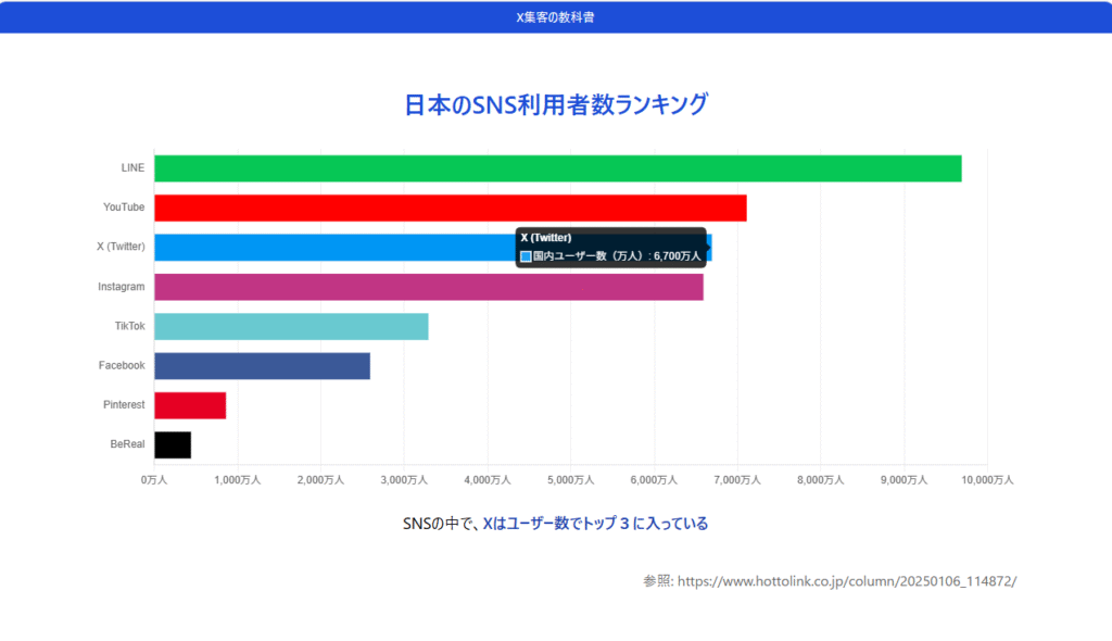 日本国内におけるSNS利用者数ランキングでは、LINE・YouTubeに次いでXは第3位。Instagramよりも多くのユーザーに利用されており、その規模感は決して無視できるものではありません。