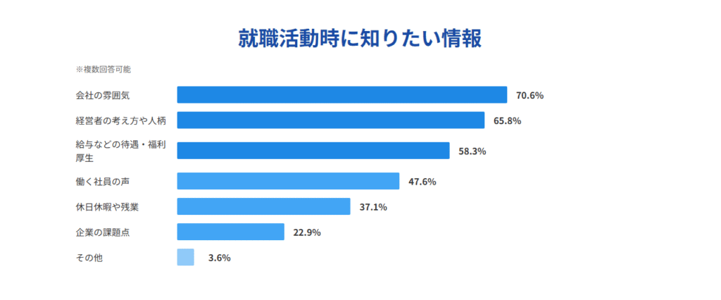 さらに、学生や求職者が「企業選びで知りたい情報」として最も重視しているのは、「会社の雰囲気」であるという調査結果もあります。